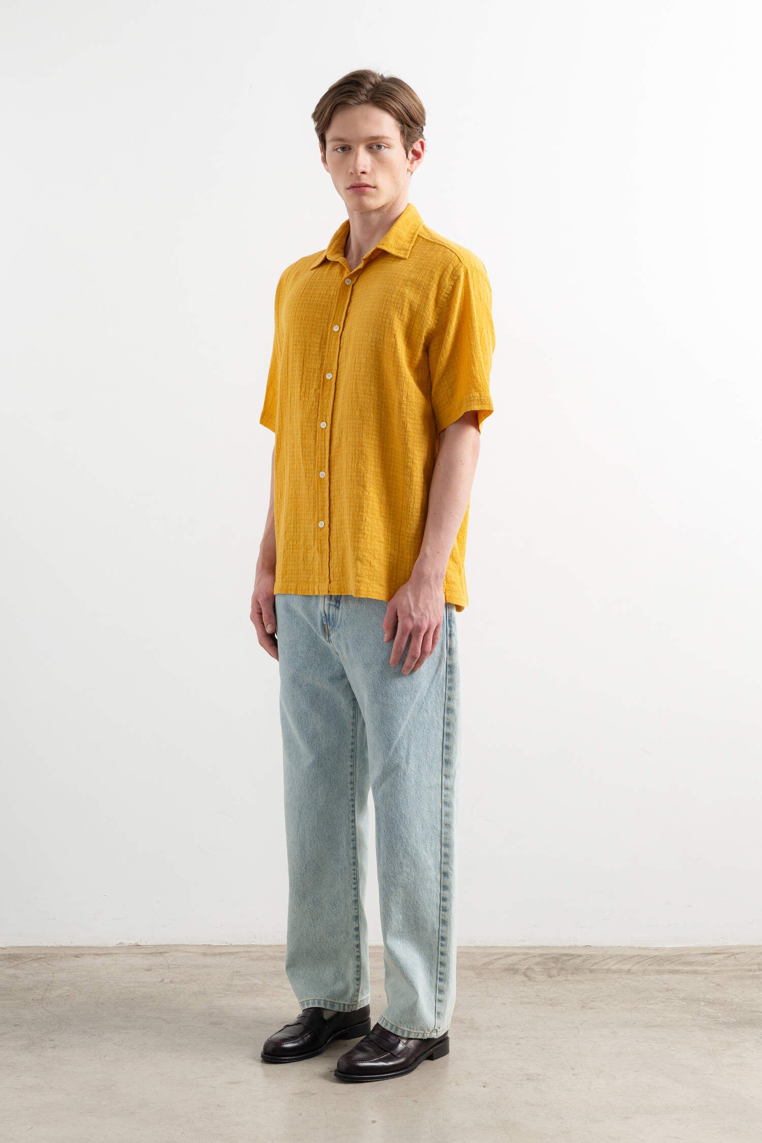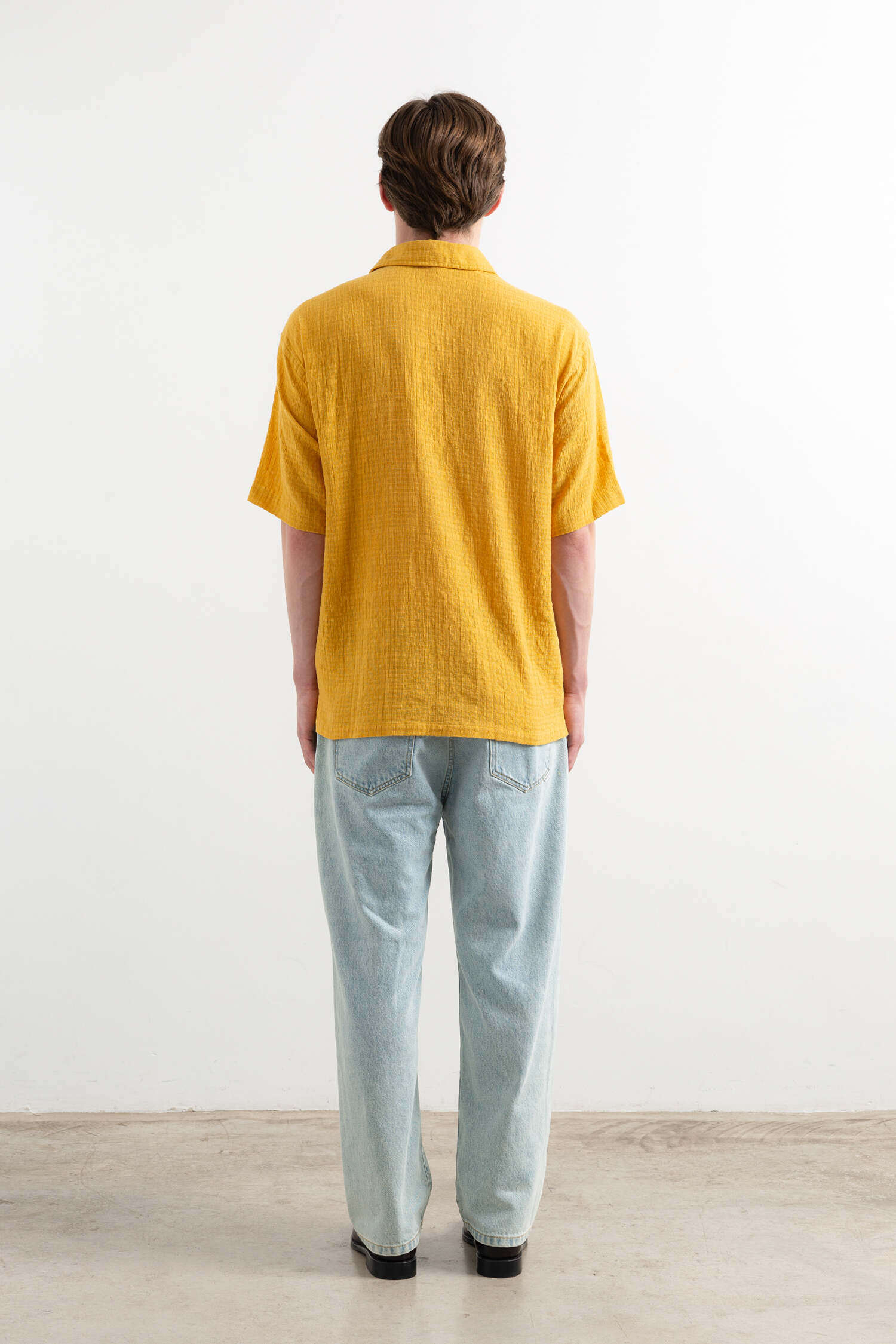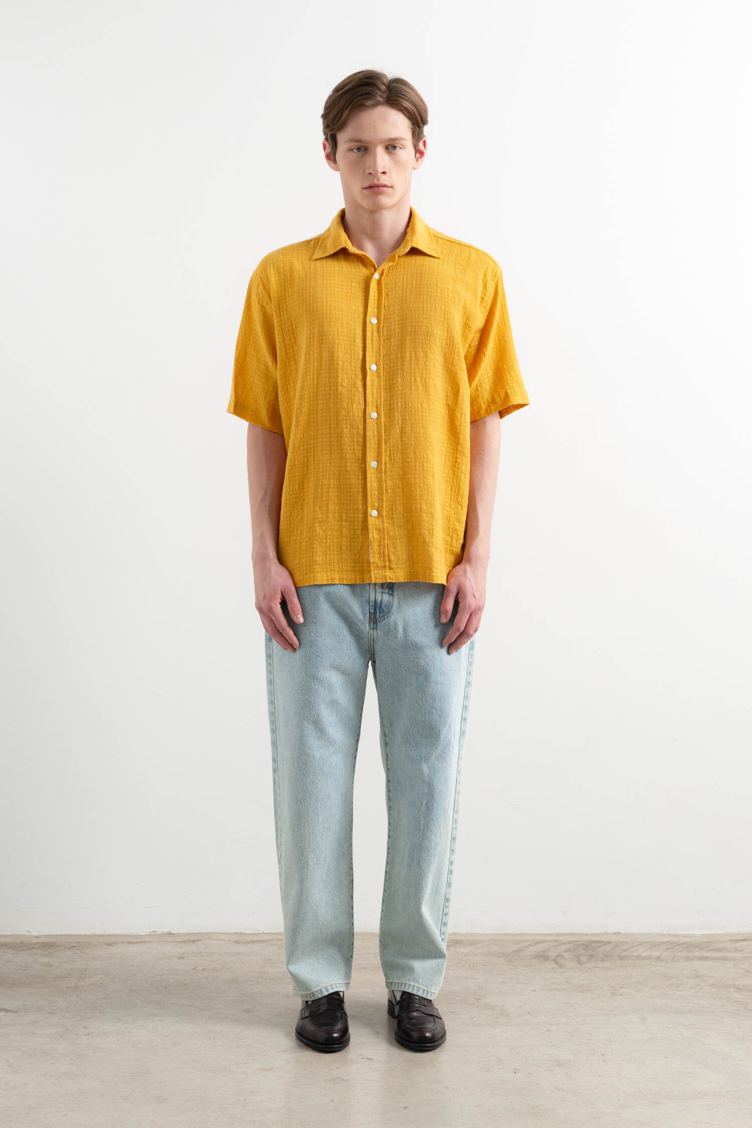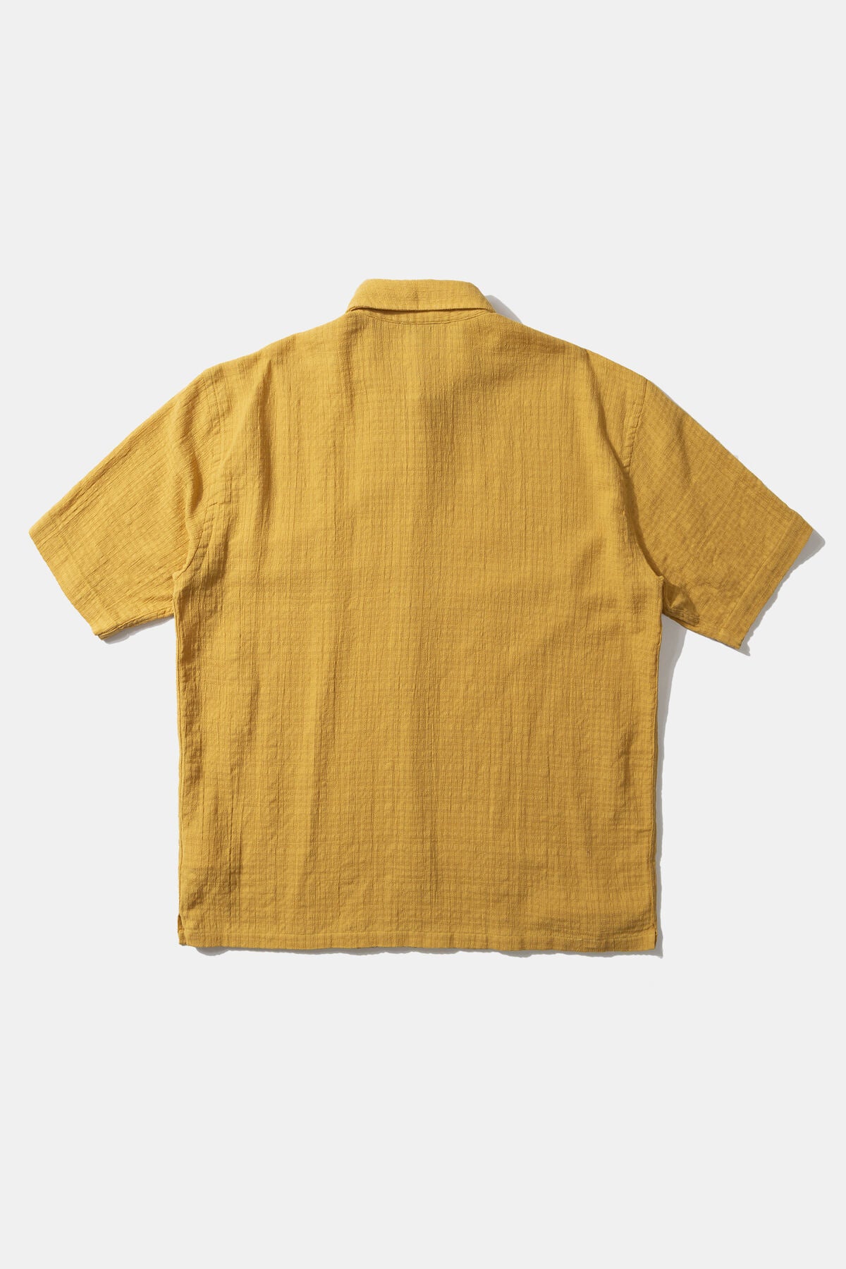 Mustard-colored short-sleeved shirt with a cutaway collar. Regular fit.